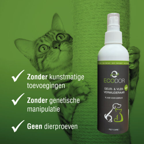 EcoPet čistilo in nevtralizator neprijetnega vonja po živalih je naravno sredstvo, ki uspešno očisti madeže urina, blata in krvi. Primerno je za čiščenje ležišč, kletk, mačjih stranišč in ostalih predmetov, ki so v stiku z živalmi. Izdelke očisti in nevtralizira neprijeten vonj na njih in njihovi okolici. Sredstvo je primerno tudi kot osvežilec zraka. Ker je brez vonjav je prijetno ljudem in živalim, ne draži dihalnih poti in ne povzroča alergij.