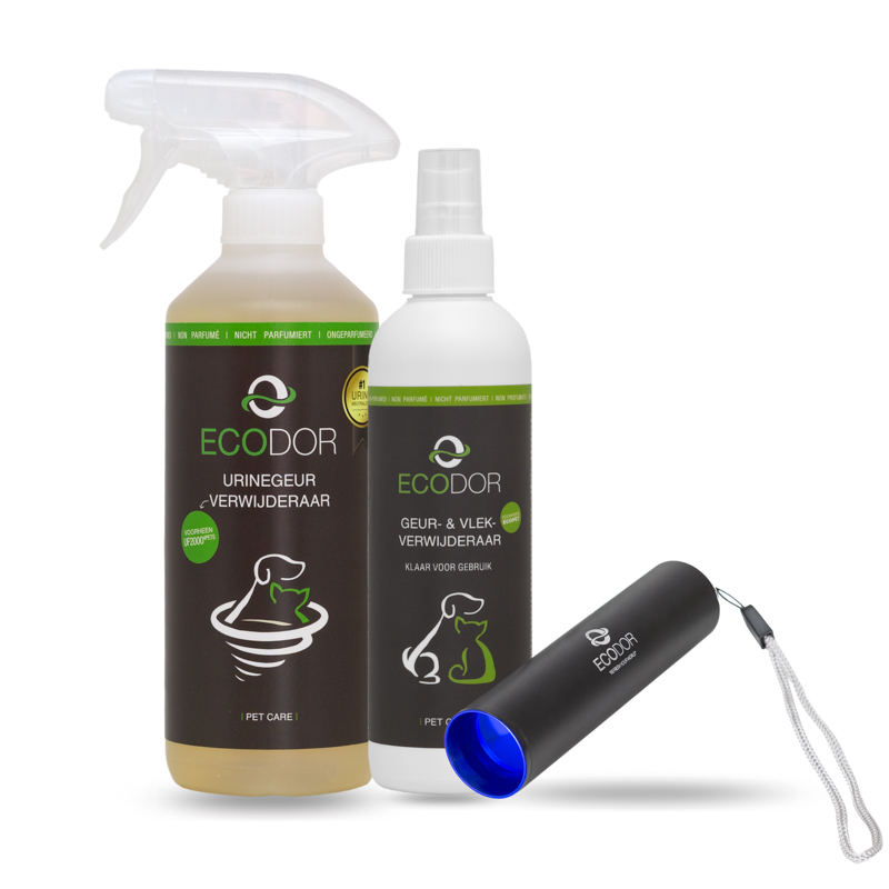 Pri nas zdaj najdete fantastičen ugoden paket z dvema izmed naših najbolj priljubljenih izdelkov: EcoPet 250ml in UF2000 4Pets 500ml. Poleg tega prejmete praktičen EcoLight Detektor Urinskih Madežev, idealen za odkrivanje skritih urinskih madežev.